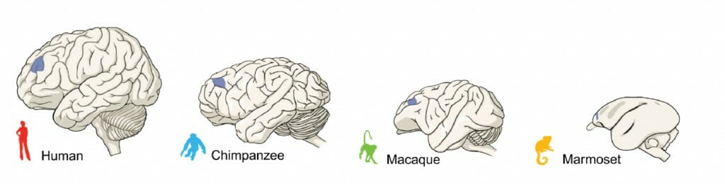 Researchers analyzed genetic material from cells in the prefrontal cortex (the area shaded in each brain) from four closely-related primates to characterize subtle differences in cell type and genetics.